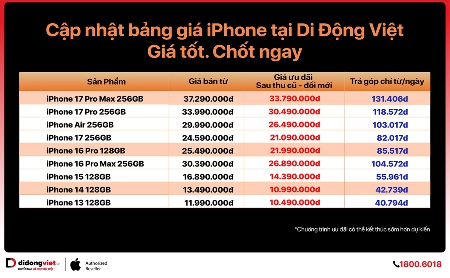 Trong giai đoạn cuối năm, mặt bằng giá iPhone tại các hệ thống bán lẻ ghi nhận xu hướng điều chỉnh giảm, đặc biệt ở nhóm máy cao cấp. Tại Di Động Việt, các dòng iPhone Pro/ Pro Max đang được nhiều người quan tâm khi giá bán đã “mềm” hơn so với giai đoạn đầu quý IV.