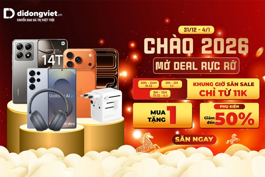 Trong bối cảnh đó, Di Động Việt triển khai chương trình “Chào 2026” trên toàn hệ thống từ ngày 31/12/2025 đến 4/1/2026, tập trung vào các ưu đãi dành cho điện thoại, phụ kiện và thiết bị công nghệ để đáp ứng nhu cầu mua sắm tăng cao của người tiêu dùng trong thời điểm chuyển giao năm mới.