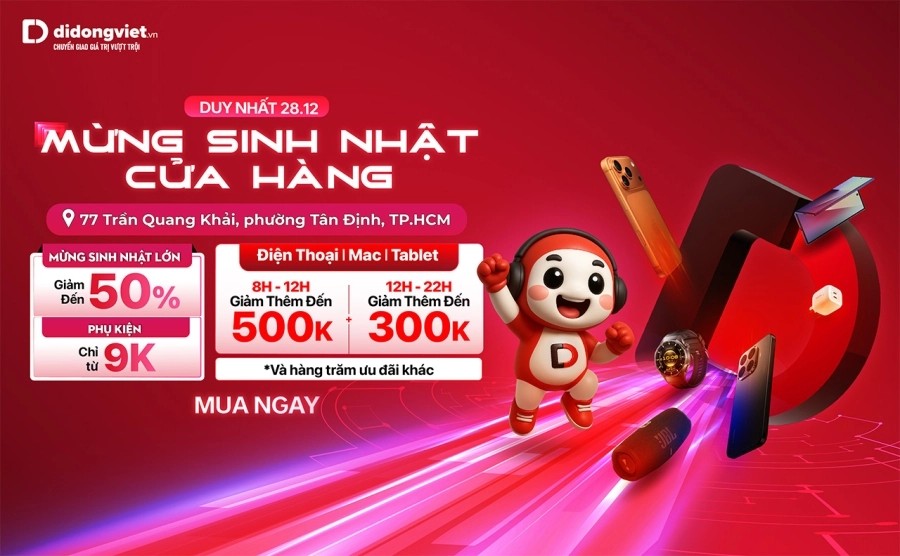 Bên cạnh các chương trình áp dụng trên toàn hệ thống, Di Động Việt cũng triển khai một số hoạt động ưu đãi theo điểm bán trong giai đoạn cao điểm cuối năm. Đơn cử, cửa hàng tại 77 Trần Quang Khải (TP.HCM) sẽ có ưu đãi mua sắm dành cho khách hàng trong ngày 28/12 nhân dịp sinh nhật.