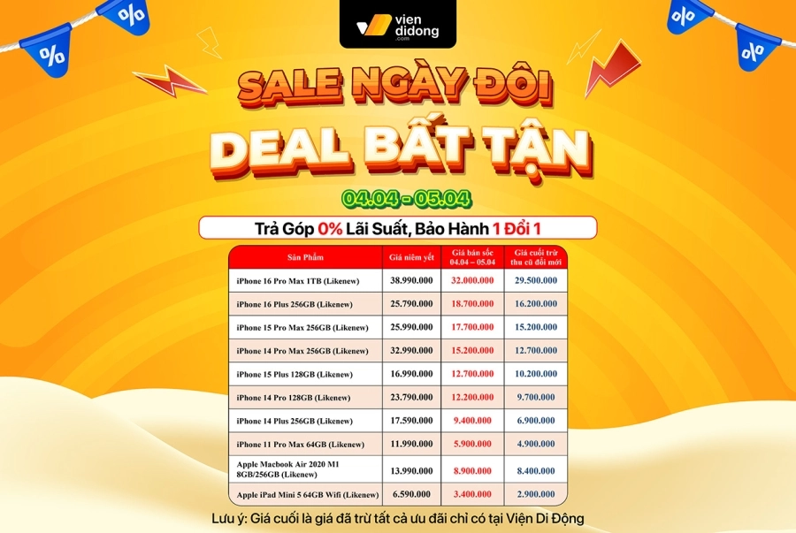 Ở dịp này, nhiều dòng iPhone cũ tại hệ thống Viện Di Động sẽ được điều chỉnh về mức giá cực tốt để người dùng tranh thủ nâng cấp thiết bị. Đơn cử, iPhone 16 Pro Max 1TB cũ có giá bán sốc chỉ 32 triệu đồng; iPhone 16 Plus cũ còn 18,7 triệu đồng; iPhone 15 Pro Max cũ còn 17,7 triệu đồng hay iPhone 14 Pro Max cũ cũng chỉ còn 15,2 triệu đồng… Ở phân khúc dễ tiếp cận hơn, iPhone 15 Plus cũ về giá 12,7 triệu đồng, iPhone 14 Pro cũ còn 12,2 triệu đồng đồng và iPhone 14 Plus cũ còn 9,4 triệu đồng.