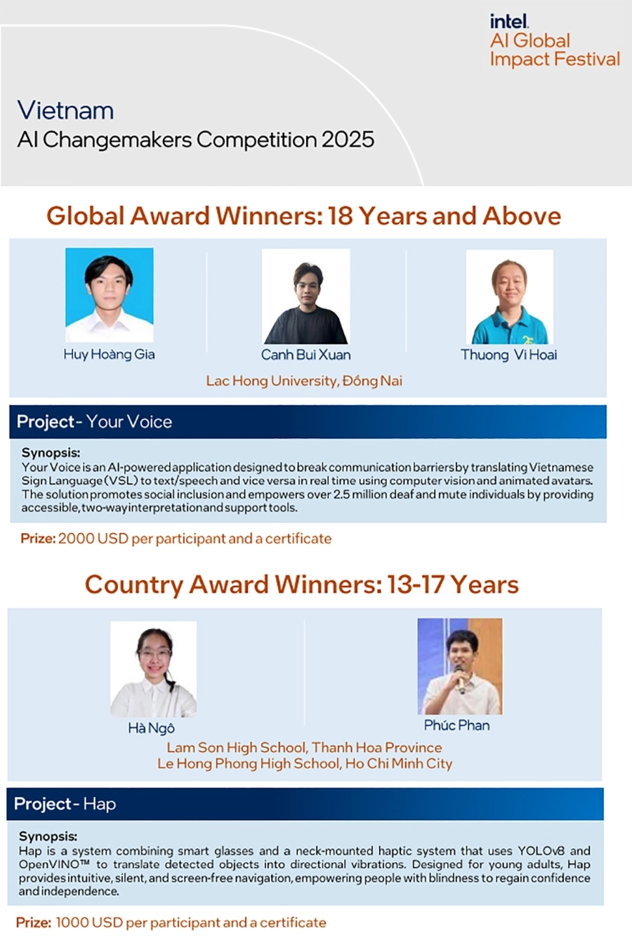 Cuộc thi Intel® AI Global Impact Festival nhằm công nhận và vinh danh các dự án AI do học sinh, sinh viên đến từ 32 quốc gia thực hiện, tập trung giải quyết những vấn đề thực tiễn trong đời sống bằng nhiều sáng kiến đổi mới sáng tạo trong lĩnh vực AI.
