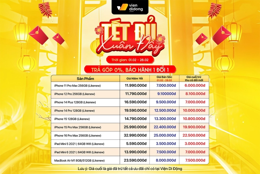 Từ ngày 01.02 đến 28.02, chương trình “Tết đủ xuân đầy” diễn ra với mức giảm giá “chạm sàn” cho điện thoại, iPad và MacBook cũ. Đây là cơ hội để người dùng nâng cấp thiết bị với chi phí tối ưu.