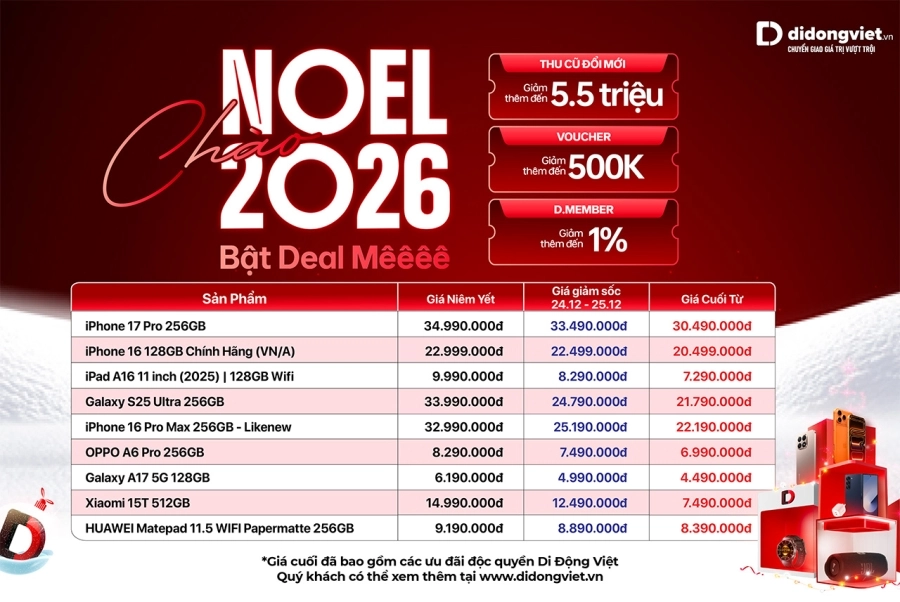 | Chương trình “Chào Noel, chào 2026 - Bật deal mê” cùng loạt ưu đãi tại Di Động Việt. |