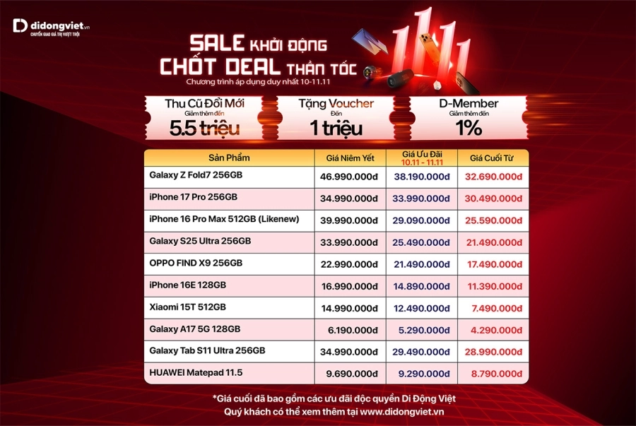 Hòa nhịp mùa mua sắm cuối năm, hệ thống bán lẻ Di Động Việt sẽ triển khai chương trình ưu đãi quy mô lớn trong hai ngày 10 đến 11/11, mang đến cho khách hàng cơ hội “săn” thiết bị công nghệ và đồ gia dụng chính hãng với mức giá thấp kỷ lục.