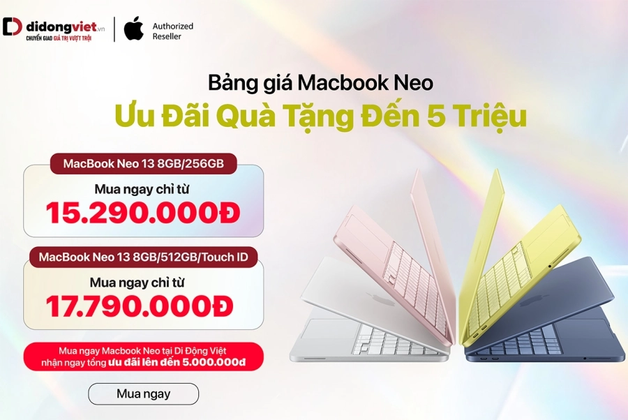 Độc giả có nhu cầu tham khảo, mua MacBook Neo hoặc các sản phẩm di động chính hãng, đồ gia dụng, xe máy điện có thể tìm hiểu thêm tại website: didongviet.vn, hoặc gọi tổng đài 1800.6018 (miễn phí).