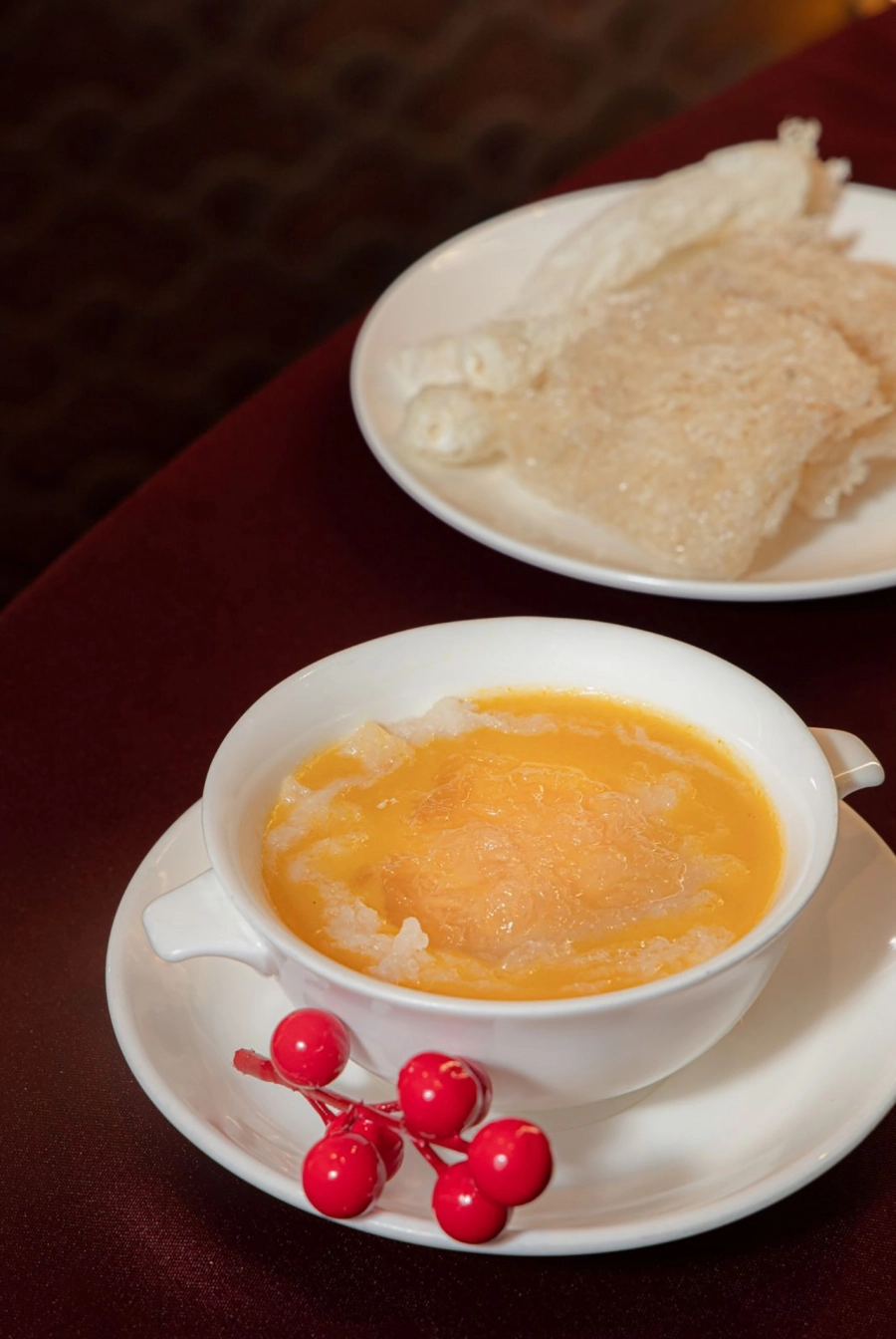 Khai mở bàn tiệc là Gỏi tôm hùm phát tài - món ăn thường xuất hiện trong các buổi tiệc đầu năm, hàm ý may mắn và khởi đầu trọn vẹn. Tôm hùm tươi được chế biển kỹ lưỡng, giữ trọn độ ngọt tự nhiên, kết hợp cùng rau củ thanh mát, tạo nên tổng thể hài hòa cả về hương vị lẫn hình thức. Hành trình thưởng thức nối tiếp với súp yến sào trúc sanh được chắt lọc từ những nguyên liệu bổ dưỡng, mang hương vị thanh nhẹ. Từng sợi yến trong vắt quyện trong nước dùng sánh mịn, tựa lời hỏi thăm sức khỏe ân cần dành cho các bậc trưởng bối trong thời khắc hội ngộ.