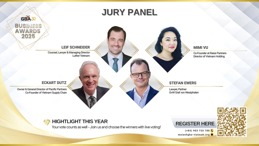 Ban Giám Khảo năm nay bao gồm Ông Eckart Dutz, Chủ sở hữu & Tổng Giám đốc Pacific Partners, đồng sáng lập Vietnam Supply Chain và giảng viên MBA tại RMIT và VGU; Ông Stefan Ewers, Đối tác tại Graf von Westphalen, luật sư quốc tế với 15 năm kinh nghiệm tại Đông Nam Á, được Asia Business Law Journal vinh danh là một trong Top 100 Luật sư hàng đầu tại Việt Nam; Bà Mimi Vũ, Đối tác tại Raise Partners và Giám đốc Vietnam Holding, được tạp chí Tatler vinh danh năm 2024 là một trong những Nhân vật có ảnh hưởng nhất châu Á; và Ông Leif Schneider, Tổng Giám đốc Luther Vietnam, luật sư được cấp chứng chỉ tại Đức với nhiều kinh nghiệm sâu rộng trên khắp châu Á.