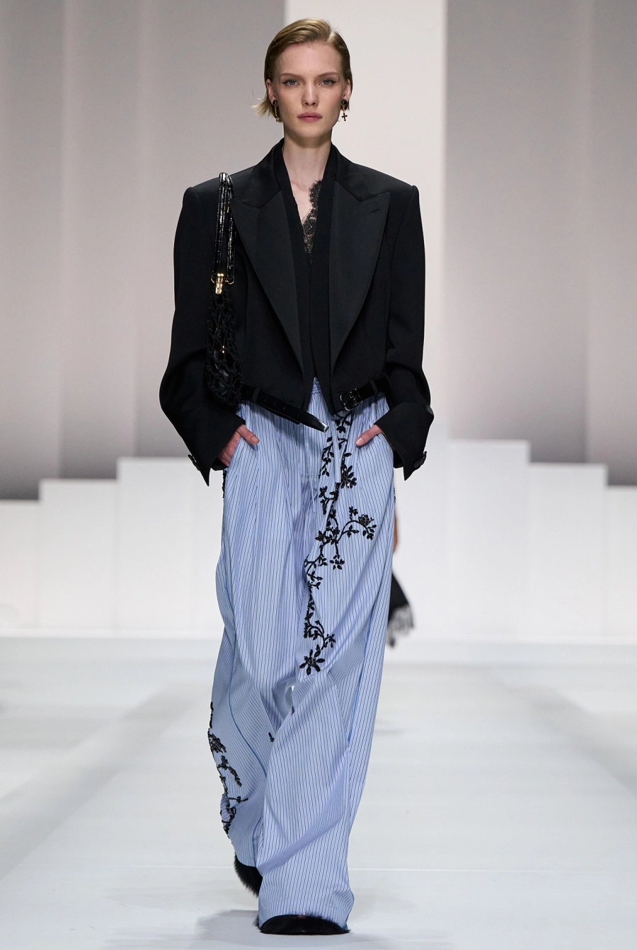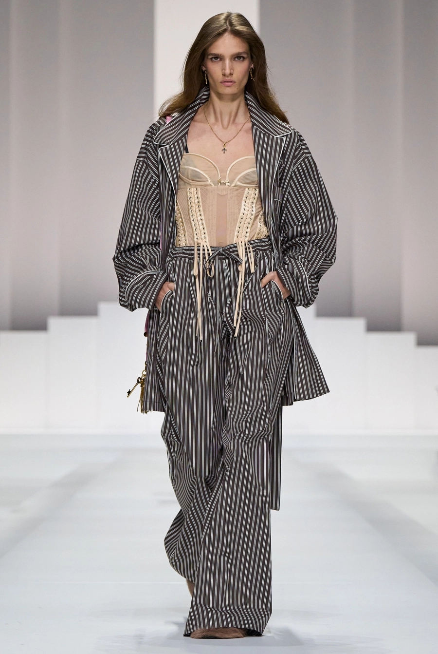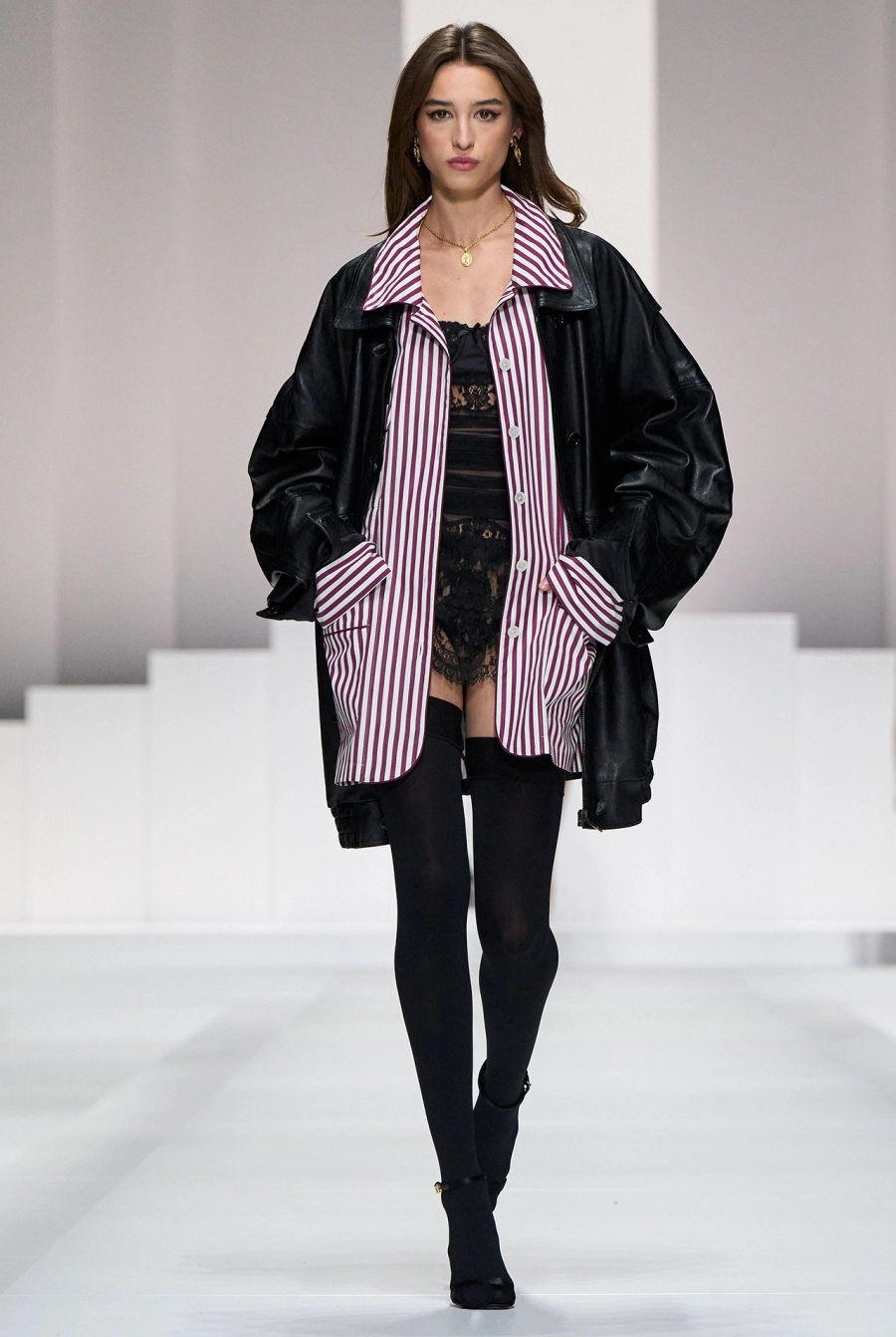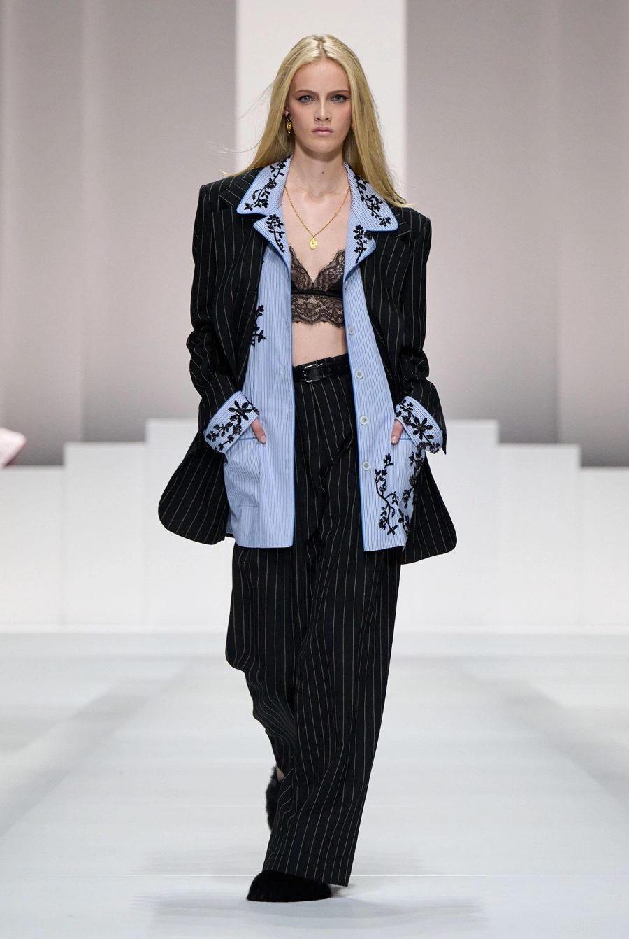 Áo khoác nam tính với đường cắt hoàn hảo và vai mạnh mẽ – khi thì phom rộng, khi lại thắt eo – trong các chất liệu kẻ sọc, mouliné và lanh-viscose nhẹ. Bảng màu trung tính và trầm (trắng, be, đen, nâu, bordeaux) khắc họa nét thanh lịch vượt thời gian. Khi kết hợp cùng bralette ren hoặc áo thêu, chúng làm nổi bật sự đối nghịch đầy cuốn hút giữa uy quyền và quyến rũ.