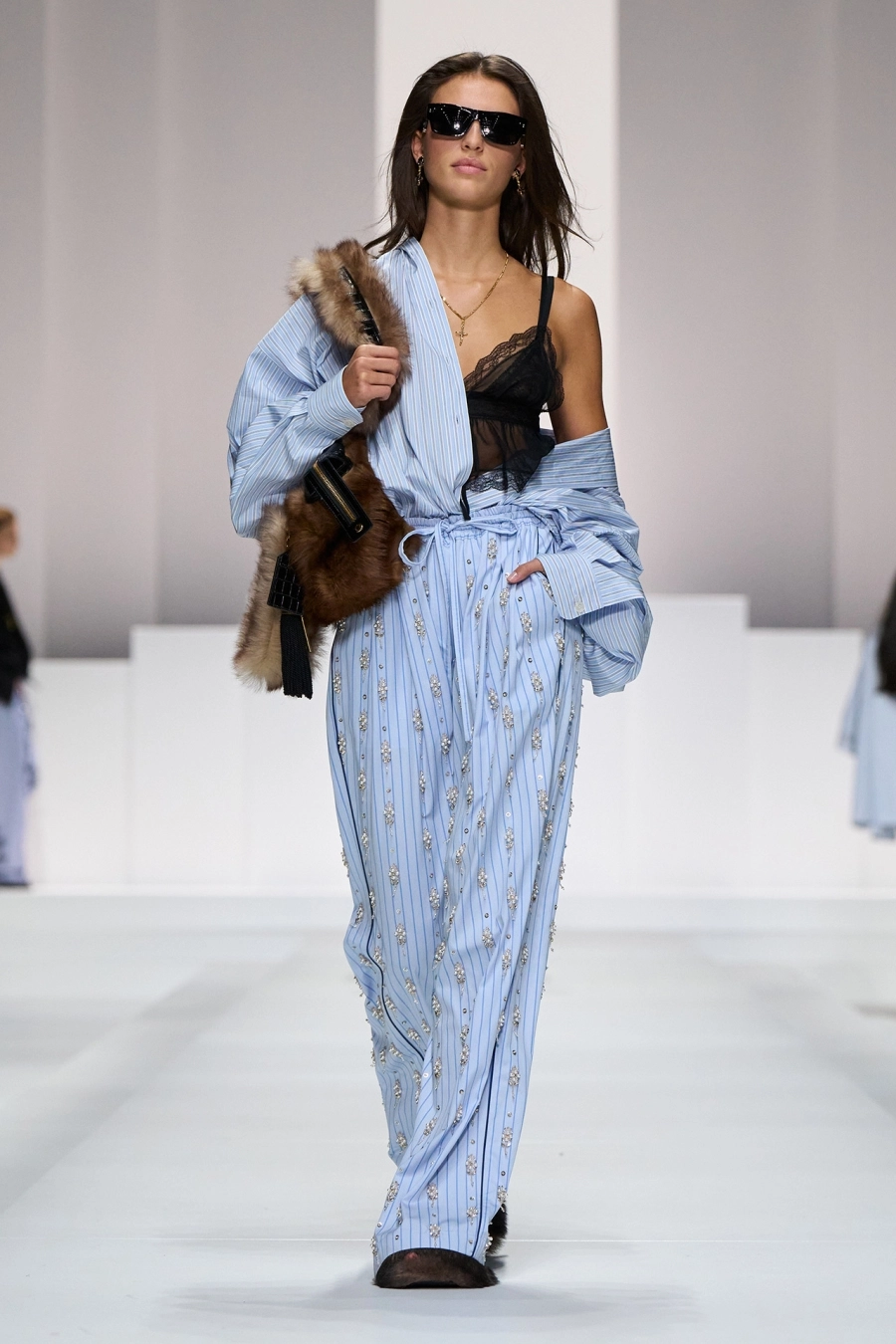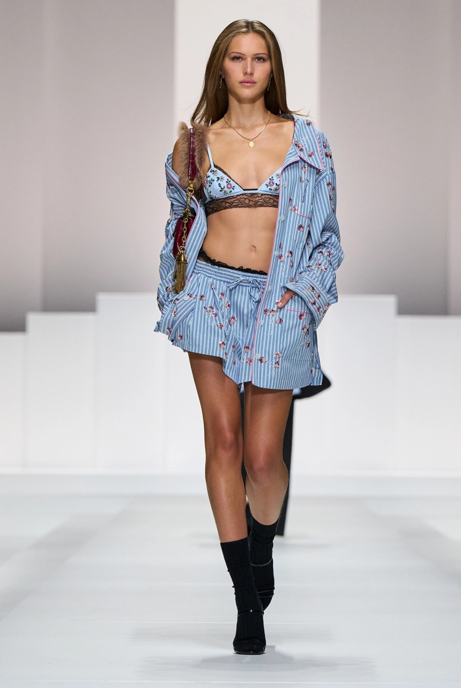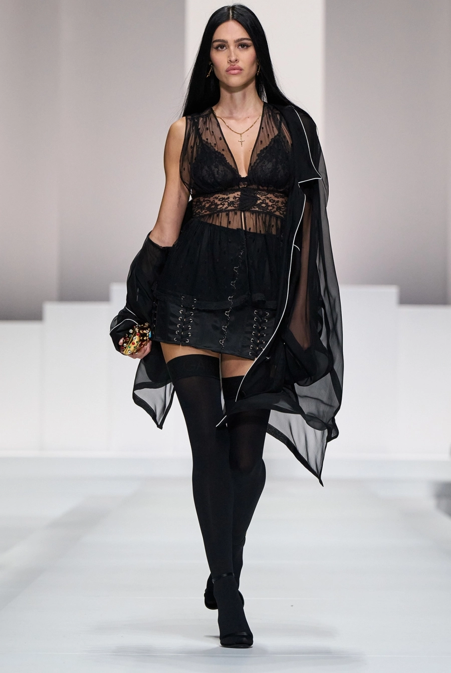 Áo sơ mi và quần mang phong thái nam tính với phom dáng đa dạng – từ oversized thoải mái đến slim fit tinh gọn. Pha lê thêu và đá quý biến trang phục vốn riêng tư thành tuyên ngôn phong cách. Bralette đính đá, corset và quần ren xuất hiện dưới áo sơ mi mở hoặc quần vải mềm, hòa quyện thành một tổng thể đầy gợi cảm. Vải xuyên thấu màu đen tái định nghĩa trang phục ngủ: tinh tế, quyến rũ và thu hút mọi ánh nhìn.