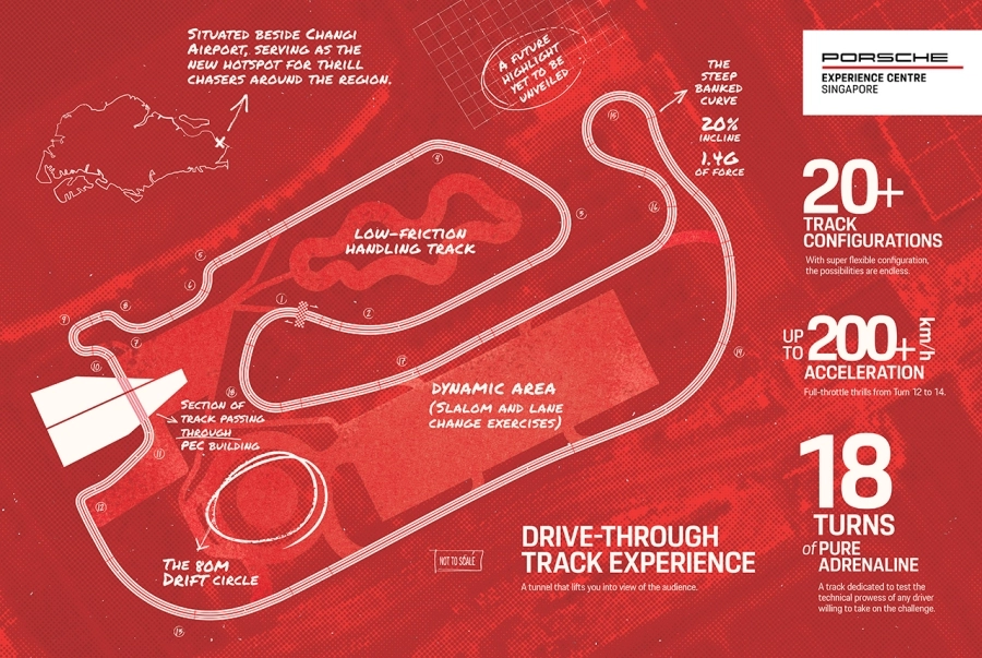 Tiêu điểm của ấn phẩm ‘Raceborn’ là hình ảnh ý tưởng thiết kế chính thức của Trung tâm trải nghiệm PEC Singapore, dự kiến khai trương vào năm 2027. Những yếu tố thiết kế mới đầy ấn tượng gồm có không gian sự kiện tại khối đế tòa nhà dành cho những sự kiện cộng đồng theo chủ đề như các buổi giao lưu Xe & Cà Phê, cho đến thiết kế “đường đua xuyên tòa nhà” đầu tiên trên thế giới của Porsche - nơi các tay lái sẽ băng qua tòa nhà PEC Singapore trước khi tăng tốc vào một đường cong dẫn ra đường thẳng chính.